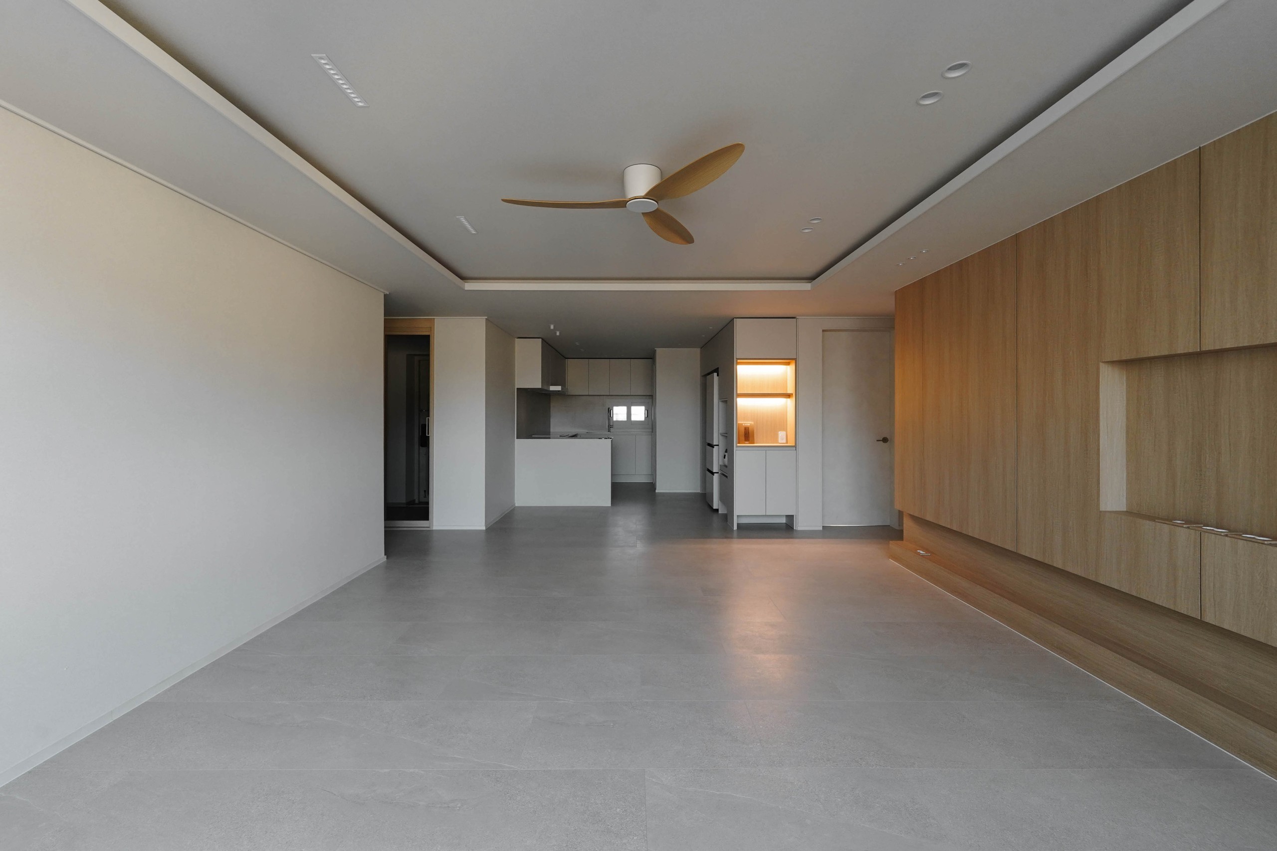 거실은 우드 아트월과 입체적인 조명, 우물천장과 실링팬으로 깊이감 있는 공간을 구현했으며